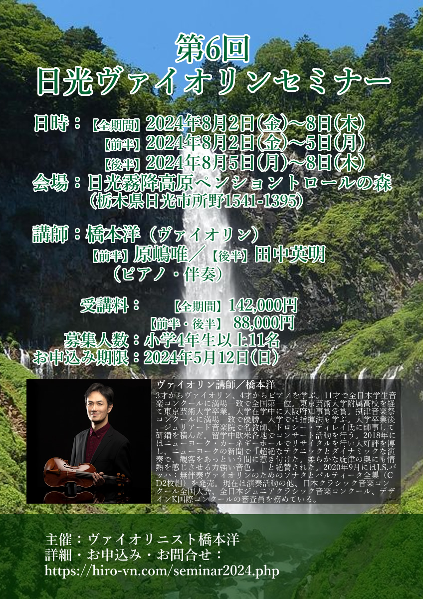お陰様でご好評を頂き、第6回となる日光ヴァイオリンセミナーを栃木県日光市で開催する運びとなりました。コンクールを目指す方や音大音高を目指す方などのご参加をお待ちしております。